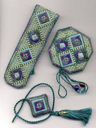 The project will be offered in the teal-on-green scheme shown below and in five alternate colorways shown at www.crvc-ega.org.  The kit includes the XOctagon #21 chartpack, a 10" square of 18-mesh canvas, one skein each of Watercolours, Wildflowers, perle 5, floss, Tiara and two of Flair and/or Frosty Rays, #22 tapestry needle and a length of ribbon for use in making the needlebook.