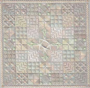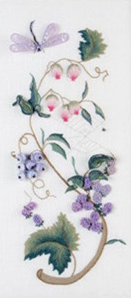 Fantasy Remembered Luan Callery Stumpwork is the art of raised embroidery. In this piece the twisting vine holds many dimensional fruits of fancy. Included are padded and wired leaves, raised fruit and wrapped berries. Some of the fruit is padded and stitched directly onto the linen, while others are worked on another fabric, called a slip, embellished with beads and later appliquéd to the linen using self-fabric for the padding. Beads are wrapped with stranded cotton and a short stem is added before attaching to the vine. A dragonfly with iridescent wings and a beaded tail gracefully hovers above while a little spider carefully spins its web among the fauna. Stitches used are couching and buttonhole, outline, french knots, lazy daisy, split and satin, and long and short shading. If you have had difficulty executing your shading stitches as well as you would like, follow the exercises in this course and learn the technique of blending with long and short stitches. |